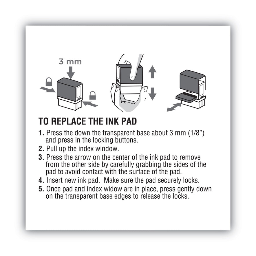 Changing ink pads is easy with this snap in, snap out cartridge style. Delivers up to 5,000 impressions. Stamp Pads Type: Inked Replacement; Ink Pad Type: Cartridge; Refill(s) For: 2000 PLUS 1SI30PGL; Ink Color(s): Red.
