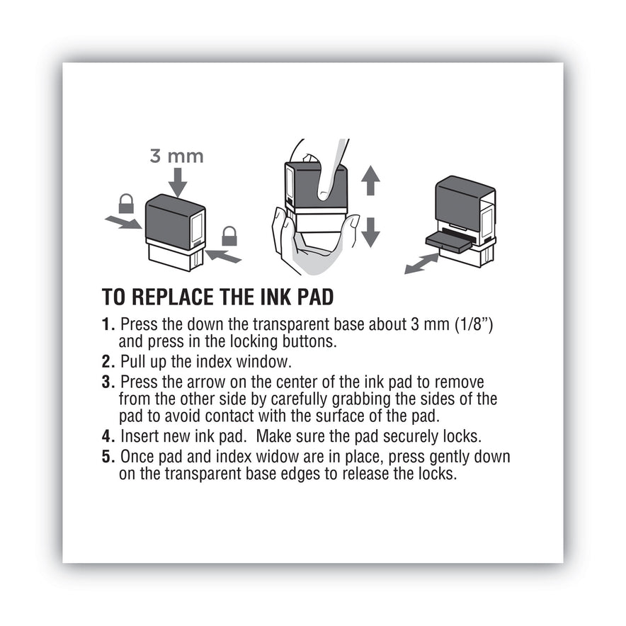 Changing ink pads is easy with this snap in, snap out cartridge style. Delivers up to 5,000 impressions. Stamp Pads Type: Inked Replacement; Ink Pad Type: Cartridge; Refill(s) For: 2000 PLUS 1SI50P; Ink Color(s): Black.