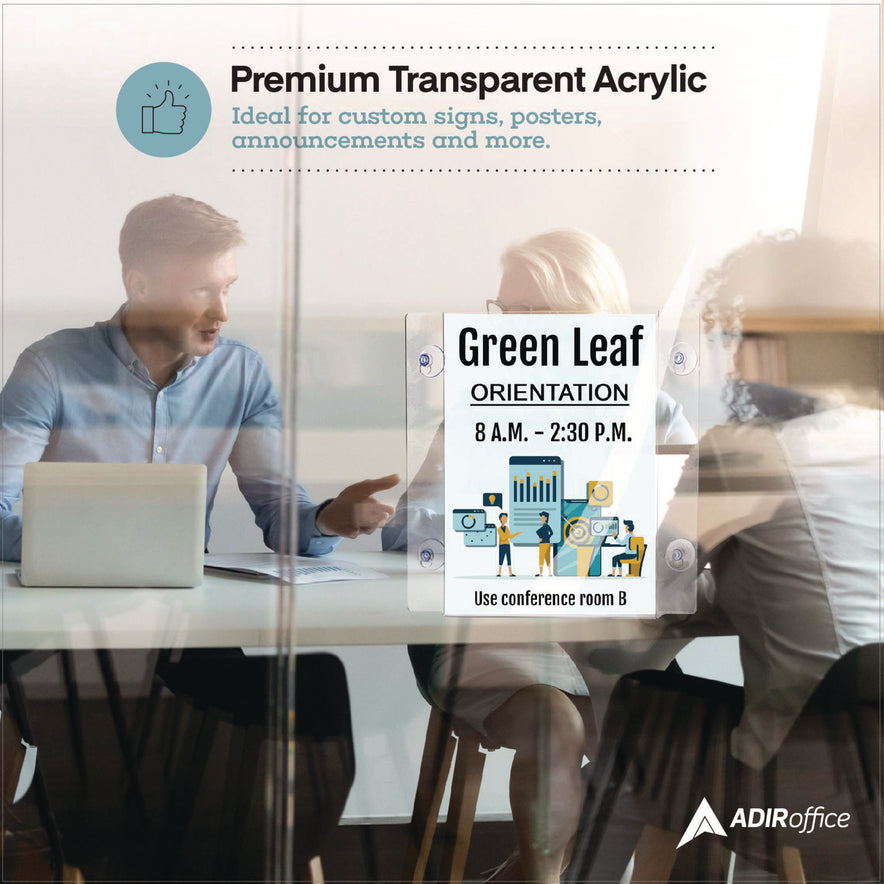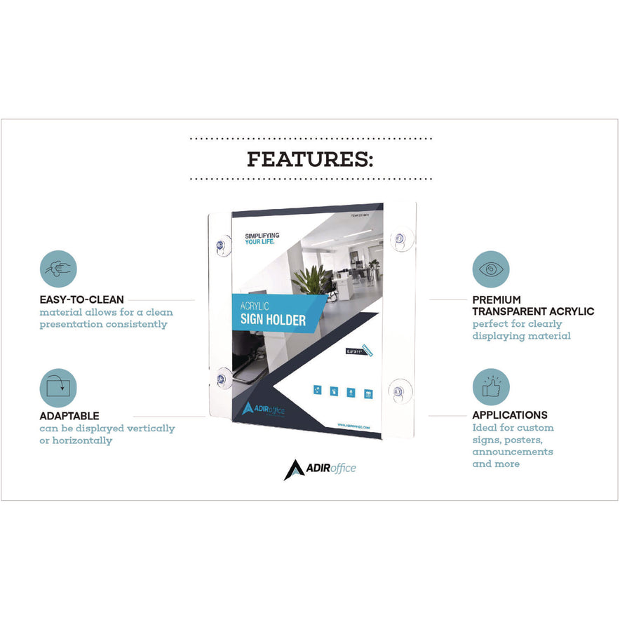 Posting temporary notices for employees, customers, special events, sales, opening/closing hours no longer needs reliance on cellophane tape, masking tape or similar stickums that leave messy residue on glass walls, doors and windows when the event is over. This sign holder is the best alternative to taped notices and subsequent challenges of removing tape residue from glass surfaces. Separate notices on large stock easily slip into the clear acrylic AdirOffice sign holder to reach incoming and outgoing patrons and personnel with relevant messages. Though firmly attached to glass surfaces with its four suction cups, the sign holder is easily lifted up and off to clean glass behind the sign support. Frame Color: Clear; Size: 8 x 11; Message(s): Customizable; Insert Size: 8 x 11.