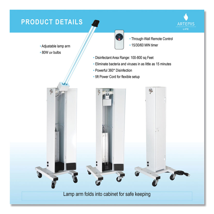The Mobile UV Light Room Sterilizer is a portable UVC sterilization lamp used to disinfect both surfaces and the air in any type of room. The lamp is foldable, making it easy to adjust to the appropriate angle for disinfecting any room configuration. This device includes foldable lamp, lamparm adjustment, handle, timer, wireless remote, and built-in 80W ultraviolet sterilization bulb. Base Color: White; Plug Type: 3 Prong; Height: 28.7"; Width: 8.7".