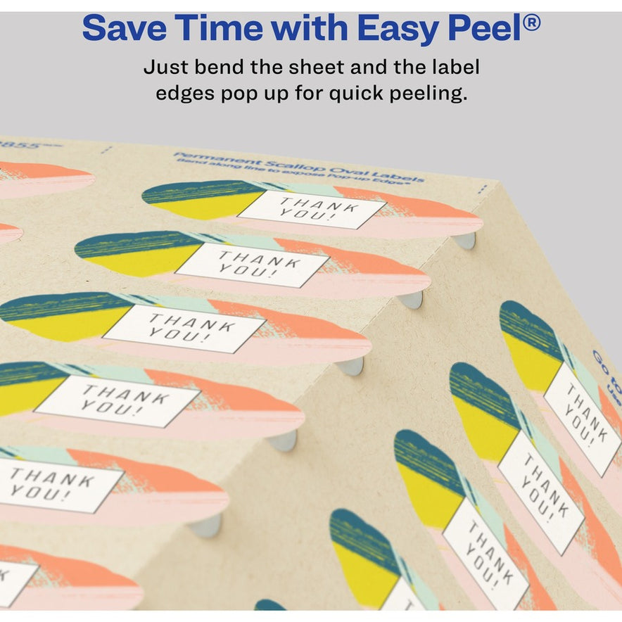 These Kraft Brown Scalloped Labels provide an earthy, natural look for showcasing your brand, logo or product name and are ideal for use on products, brochures, mail pieces and other business items. Made from a high percentage of post-consumer content, the labels are very earth-friendly. Patented, Easy Peel label sheets with the Pop-up Edge ensure a quick, easy application. Simply bend the label sheet back, peel and return the sheet to a flat position. It's that easy. The print-to-the-edge capability lets you add bold colors and text to the edge of the label. The permanent adhesive sticks to glass, plastic, paper and more so you can put your mark on nearly any product. With free online templates and designs, you can easily customize the labels with your branding in mind. Labels are compatible with both laser and inkjet printers. More from the Manufacturer