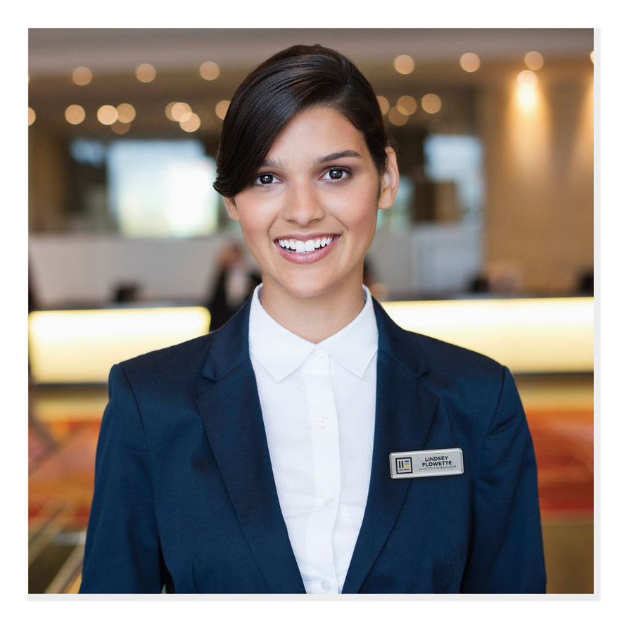 Do-it-yourself employee and event name badges. Quickly and easily customize your badges with these non-adhesive peel off insert sheets and easy-to-use website. Re-usable components for a more cost effective badging solution. Exceptional quality including strong rare earth magnet fasteners. Comfortable to wear. Premium, professional look in minutes. Complete Kit for Laser Printers. Orientation: Horizontal; Name Badge Holder Length: 3"; Name Badge Holder Width: 1"; Name Badge Holder Color(s): Silver.
