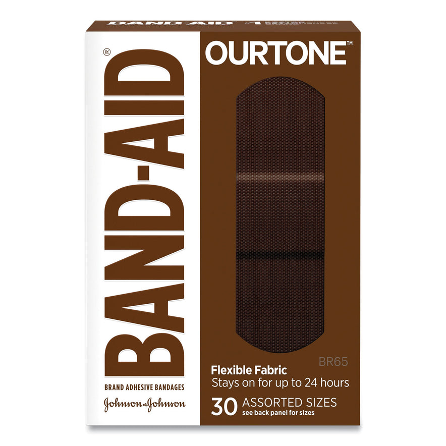 BAND-AID OurTone Adhesive Bandages, BR65, 2.25 x 0.63; 3 x 0.75; 3 x 1, Deep Brown, 30/Pack (119587)