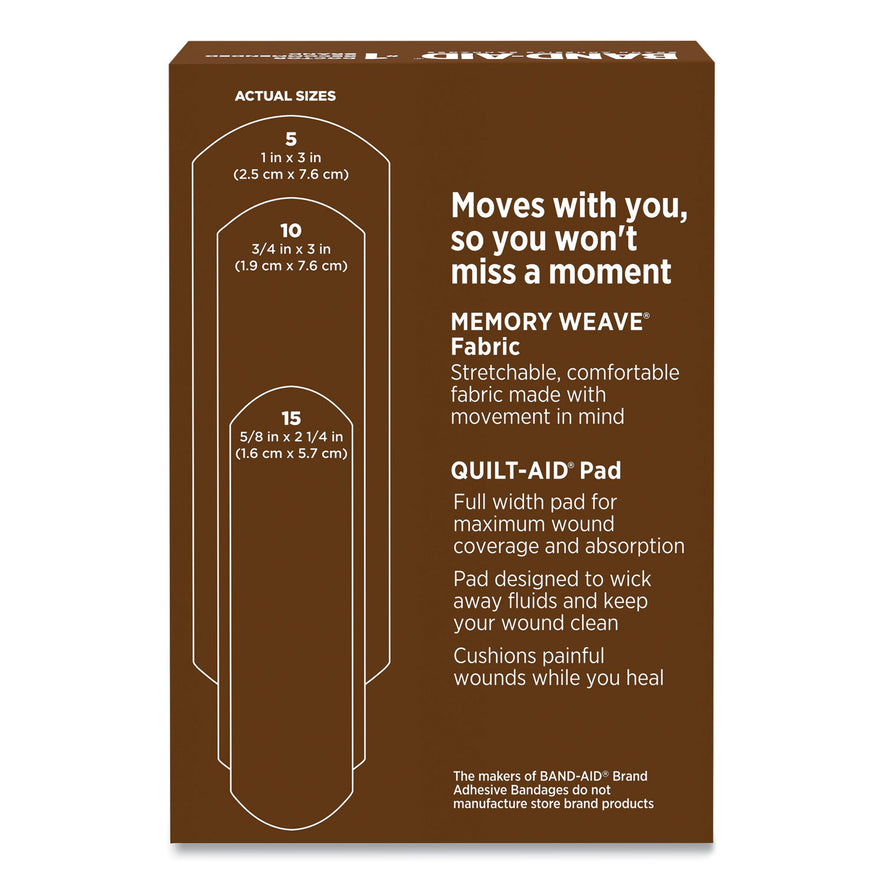 Band-Aid Brand Ourtone Flexible Fabric Adhesive Bandages in assorted sizes provide a wound care option in shades for brown skin tones. Designed to blend in with your skin tone, these fabric bandages are made with memory weave fabric to cover and protect minor wounds, cuts and scrapes by stretching, bending, and flexing with your skin as you move. From the #1 doctor recommended bandage brand, the flexible bandages protect against dirt and germs for up to 24 hours to help with your healing wounds. Each bandage features a Quilt-Aid pad for complete coverage that won't stick to the wound as it wicks away blood and fluids, allowing for gentle removal. Apply the sterile adhesive bandage to clean, dry skin for minor wound care and change daily, when wet, or as needed. Launching a range of bandages in shades for brown skin tones, Band-Aid Brand Ourtone Adhesive Bandages embrace the beauty of diverse skin. Deep BrownShade BR65. Bandages Type: Standard; Material(s): Fabric; Mounting: With Adhesive; Length: 2.25"; 3".
