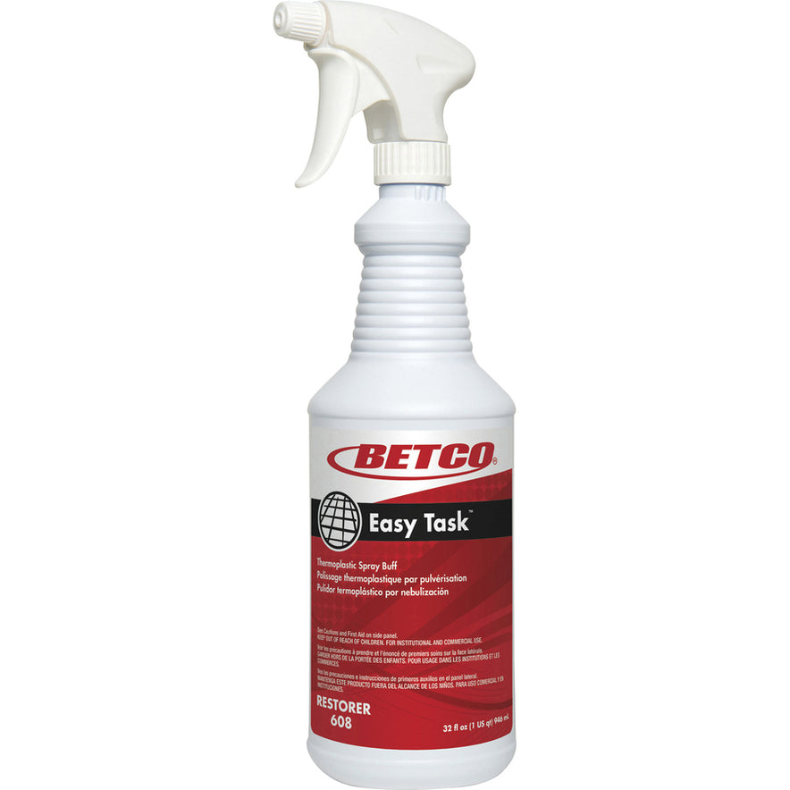 This spray buffing compound combines detergents, thermoplastics and solvent for the answer to terrific-looking floors. Easy Task Thermoplastic Spray Buff provides effective repair of all floor finish types. Simply spray on floors and polish with a spray buff pad to easily remove black heel marks, scuffs and scratches leaving a wet look gloss. Regular use of this spray buff will allow you to reduce stripping and re-waxing procedures by more than 75 percent. Spray buff leaves floor finish very hard and durable yet slip-resistant. Excellent lubricity of pad surface yields a higher shine. Versatile spray buff with clean bouquet fragrance is the perfect product for use with conventional and high speed equipment. The milky green liquid dries clear. Trigger spray is sold separately.