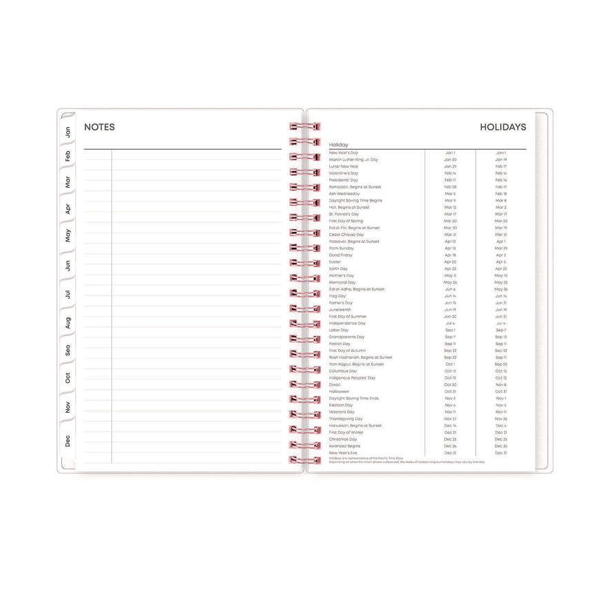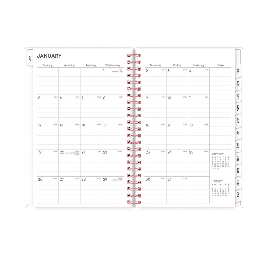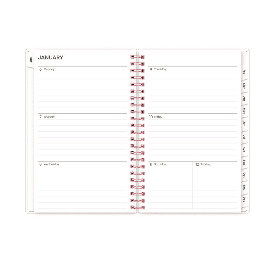 Elegant florals to accent your everyday scheduling. Weekly calendar view per two-page spread contains ruled space for your daily schedule. Two page per month spreads feature ruled daily blocks, Notes column, Sunday through Saturday scheduling, count of days/days remaining, holidays and past and future months reference. A flexible frosted cover adorns the outside while twin-wire binding and durable, coated tabs offer easy page turning and access to past, present and future months. Includes six bonus monthly views (July - Dec). Dated/Undated: Dated; Calendar Format: Weekly; Monthly; Calendar Spread Format: One Week per Two-Page Spread; One Month per Page; Edition Year: 2025.