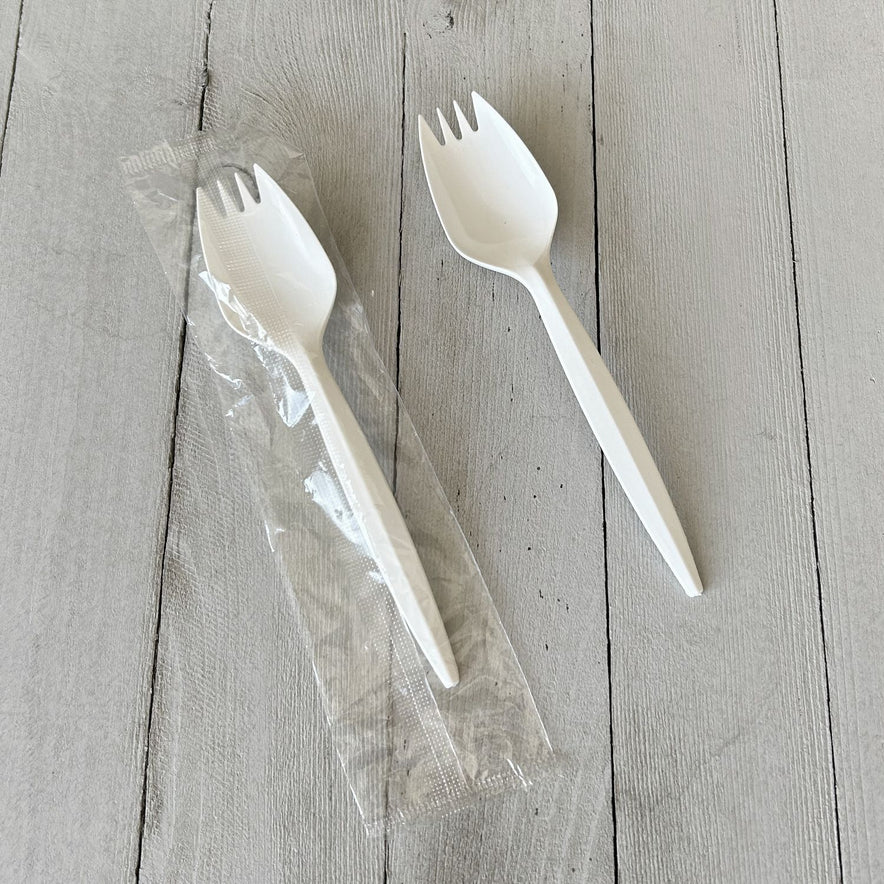 A great option for virtually any dining environment, mediumweight, wrapped polypropylene cutlery items offer quick event set-up or packing for to-go meals. Individually packaged for convenience and to ensure utensils remain sanitary, even after handling. The utensils have the versatility to be used with most cuisines, making them an ideal fit for takeout, concession stands, cafeterias, offices, events, and outdoor gatherings. Utensils Type: Spork; Material(s): Polypropylene; Color(s): White; Grade: Mediumweight.
