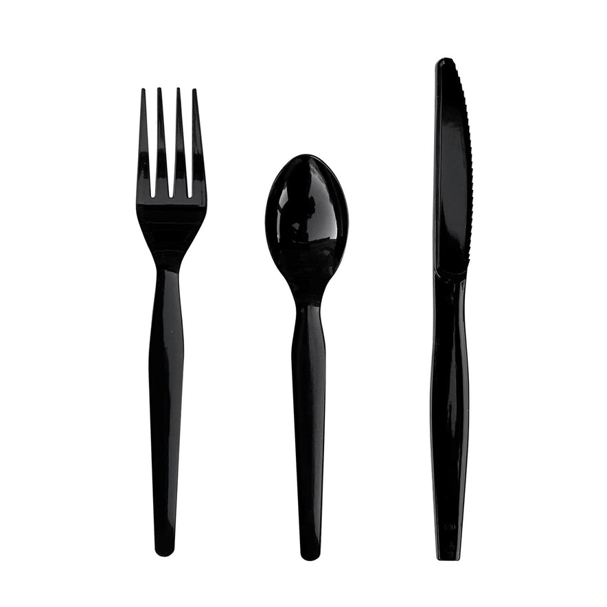 Serve virtually any meal with this cutlery kit. Each pre-packaged, cutlery wrapped kit contains a medium weight plastic fork, spoon, and knife. The convenient kits make set-up for an event or packing a to-go meal quick and easy. Individually packaged for convenience and to ensure utensils remain sanitary, even after handling. Perfect for outdoor gatherings, large parties, and take-out meals. Utensils Type: Combo Set; Material(s): Polypropylene; Color(s): Black; Grade: Heavyweight.