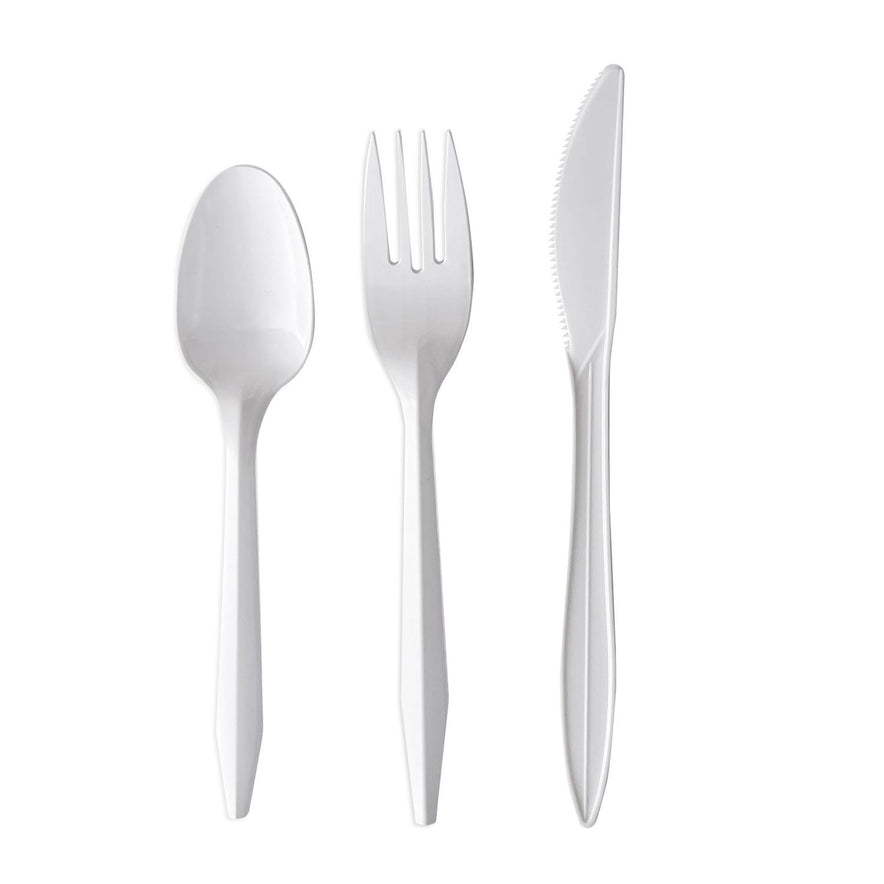 Serve virtually any meal with this cutlery kit. Each pre-packaged, cutlery wrapped kit contains a medium weight plastic fork, spoon, and knife. The convenient kits make set-up for an event or packing a to-go meal quick and easy. Individually packaged for convenience and to ensure utensils remain sanitary, even after handling. Perfect for outdoor gatherings, large parties, and take-out meals. Utensils Type: Combo Set; Material(s): Polypropylene; Color(s): White; Grade: Mediumweight.