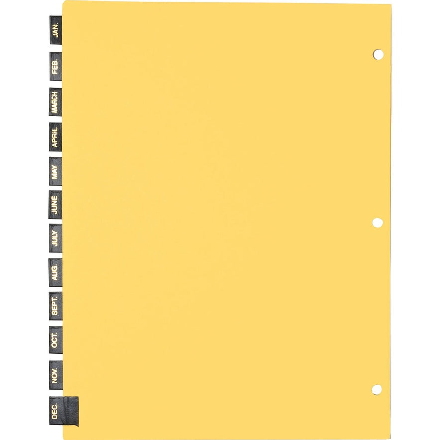 Index dividers feature black leather tabs with gold imprints. Monthly tab indexes range from January to December. Heavy-duty buff ledger paper has a gold-reinforced binding edge for extra strength. Dividers are punched for use in standard three-ring binders.