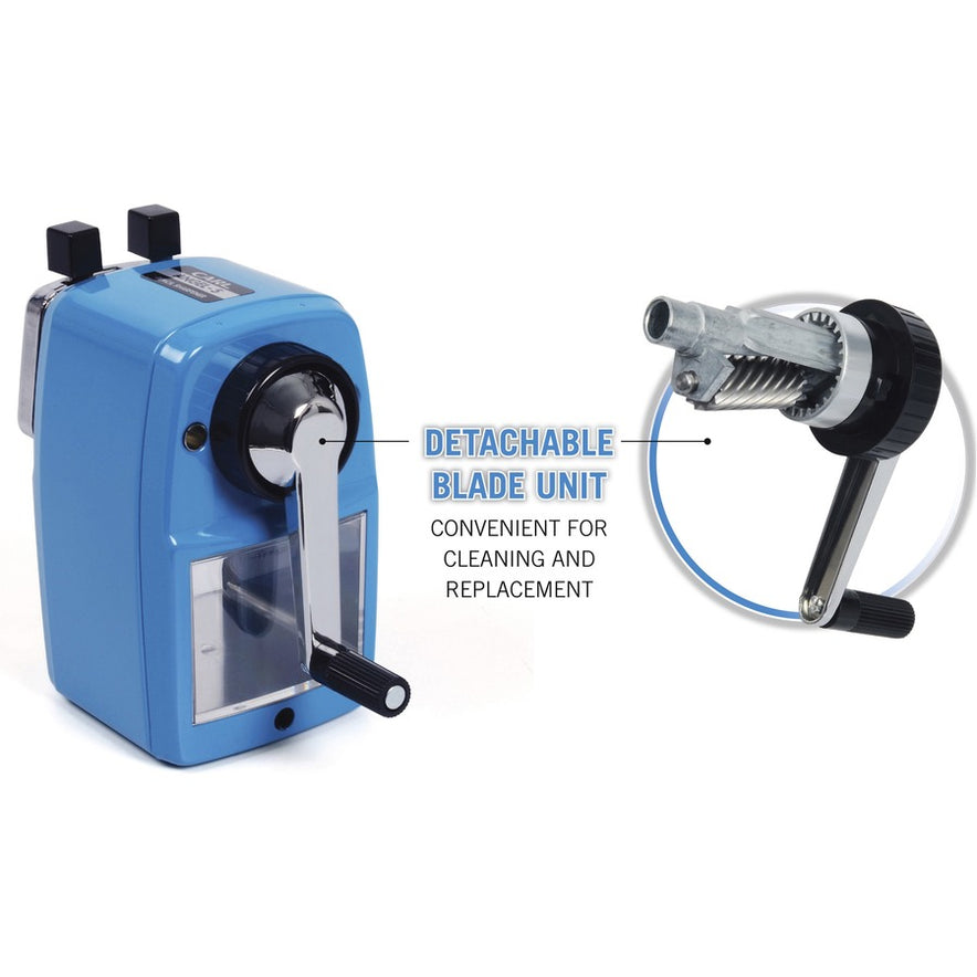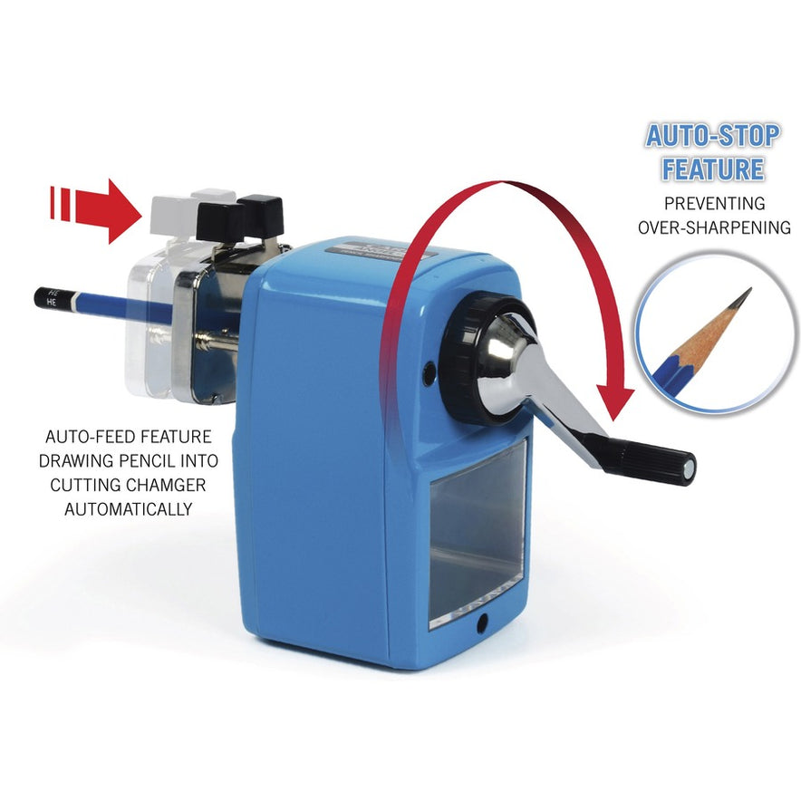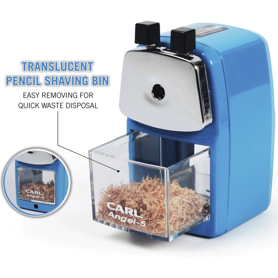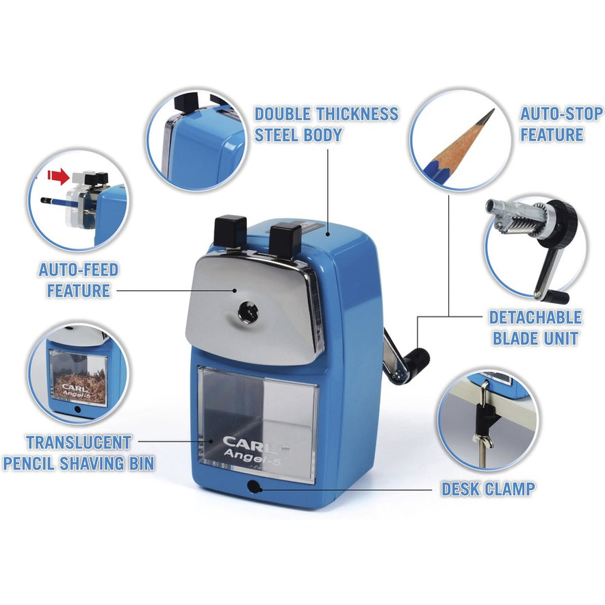 Perfect for school, home and office, the Angel-5 Royal Pencil Sharpener smoothly sharpens 0.9mm or 0.5mm lead tips with a two-stage core function. The smooth manual operation with a crank handle is quiet and classroom-friendly. Carl's Angel 5 mechanism automatically draws pencil into the cutting chamber, producing a perfect point. Once the pencil is sharp, the Angel 5 unique design will not allow the pencil to oversharpen. Shavings fall into a transparent waste tray that is removable for easy emptying. Pencil sharpener is manufactured with double-steel thickness along with a long-lasting, aluminum die-cast, internal gear mechanism and a steel case. It includes a desk clamp mount to fix it on your worksurface. Rubber feet grip base protects your desktop.