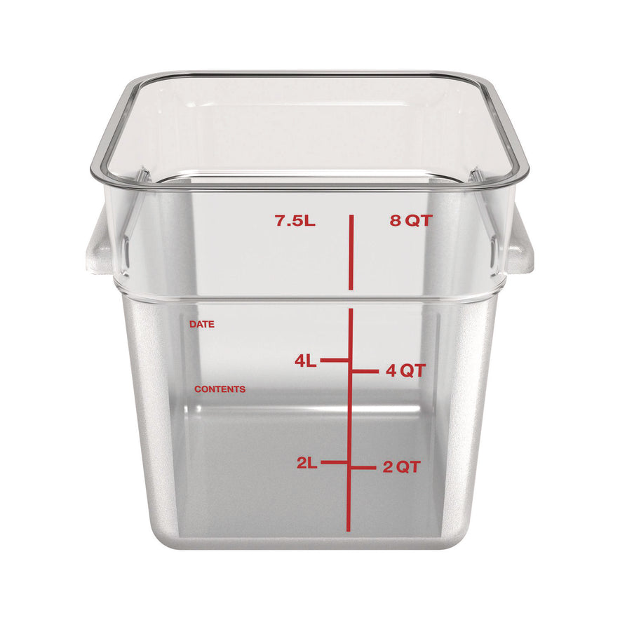 Maximize storage space for a variety of items in Carlisle Squares food storage containers! Tight fitting, color-coded lids (sold separately) encourage organization and reduce cross-contamination. Color-coded liter and quart markings match color-coded lids to ensure a quick and easy match. Keep food organized and separated for sanitary storage. Food Container Type: Base; Material(s): Polycarbonate; Material Type: Plastic; Interior Volume Capacity: 8 qt.