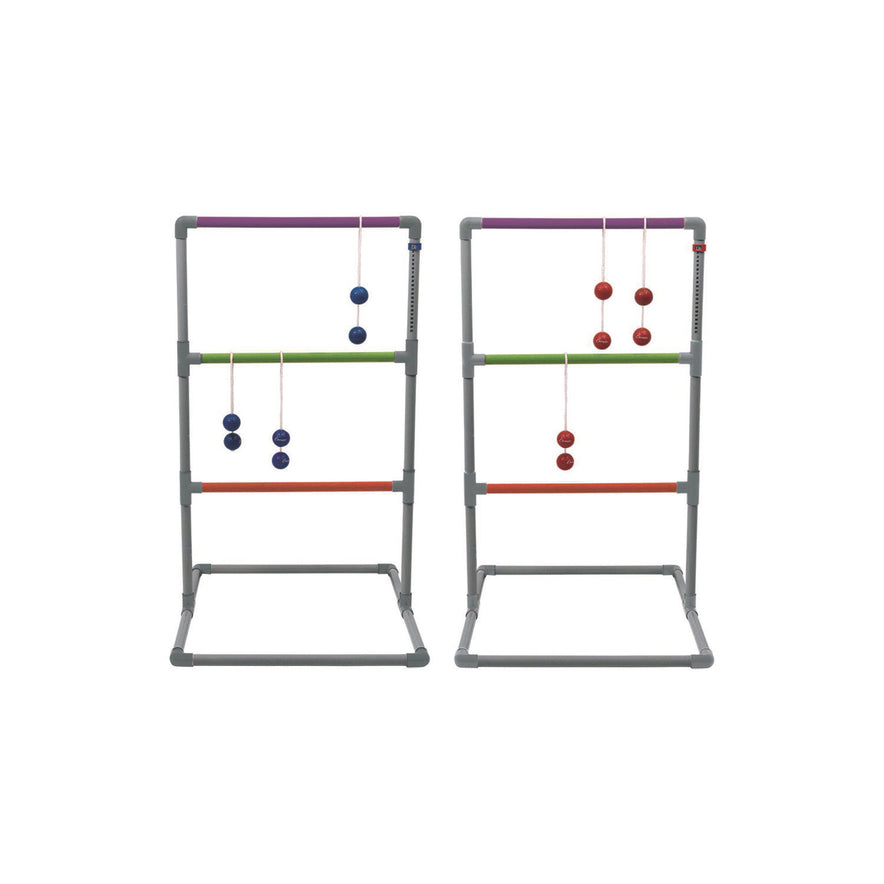 Earn points by throwing bolas at different color rung targets with the Champion Sports Ladder Golf Set. The ladder game set only takes minutes to set up and provides hours of fun at the beach, park, or your backyard. This set includes two plastic ladders with a deep base for stability, and six bolas (two weighted sponge golf balls connected by a string). Earn points by throwing the bolas at the different color rung targets! Length: 37.5"; Width: 22"; Material(s): Plastic; Playground/Gymnasium Sets Type: Ladder Ball Game Set.