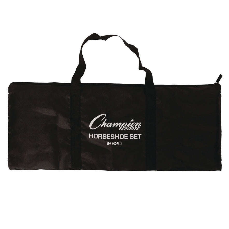 Liven up your next outdoor gathering and play an authentic game of horseshoes in the backyard or at the campsite with the Champion Sports Steel Horseshoe Set. This complete set includes standard weighted powder-coated steel horseshoes for longevity and an authentic feel, and two solid steel stakes that are easy to drive into the ground for quick setup for traditional-style play. Carry the game in the handy reusable nylon carry bag. Material(s): Steel; Playground/Gymnasium Sets Type: Horseshoe Set.