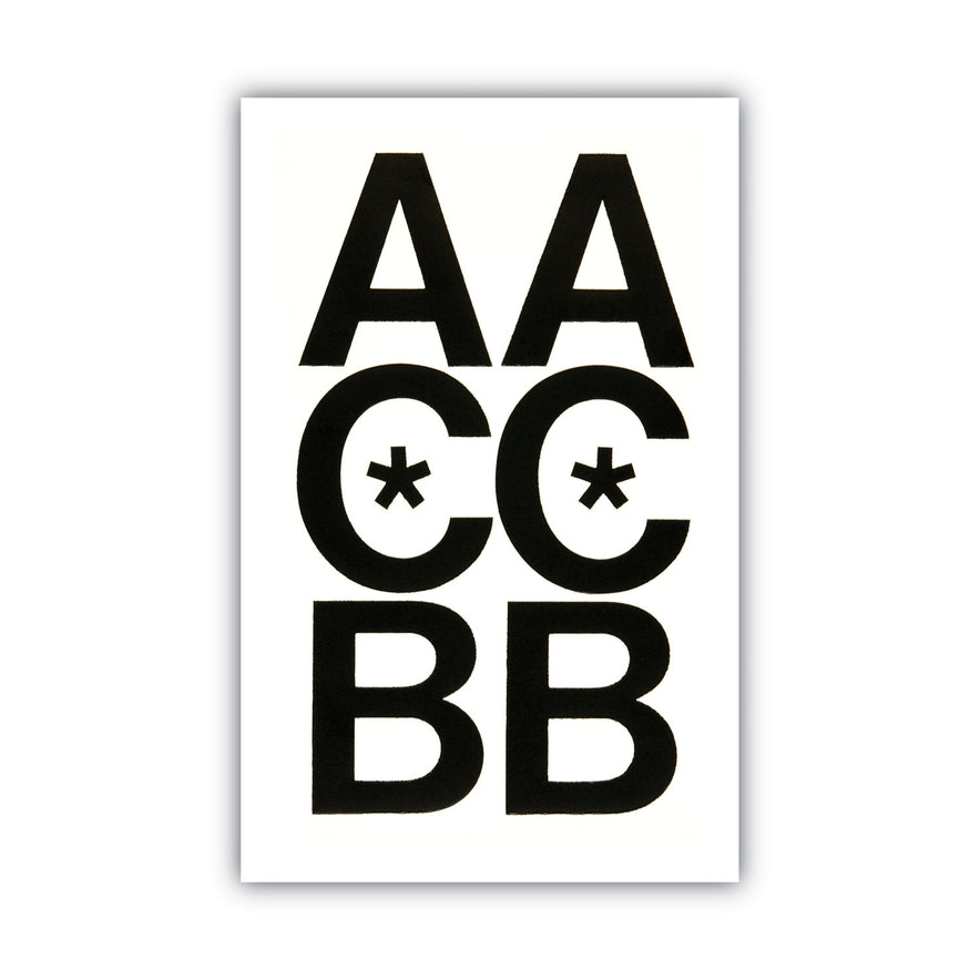 For signs, posters and equipment identification. Self adhesive vinyl will stick to most clean, dry surfaces. Can be used indoors or outdoors. Punctuation and monetary symbols included. Permanent adhesive. Uppercase Letters Only. Character Types: Uppercase Letters; Mounting Type: Self Adhesive; Character Style: Helvetica; Character Color: Black.