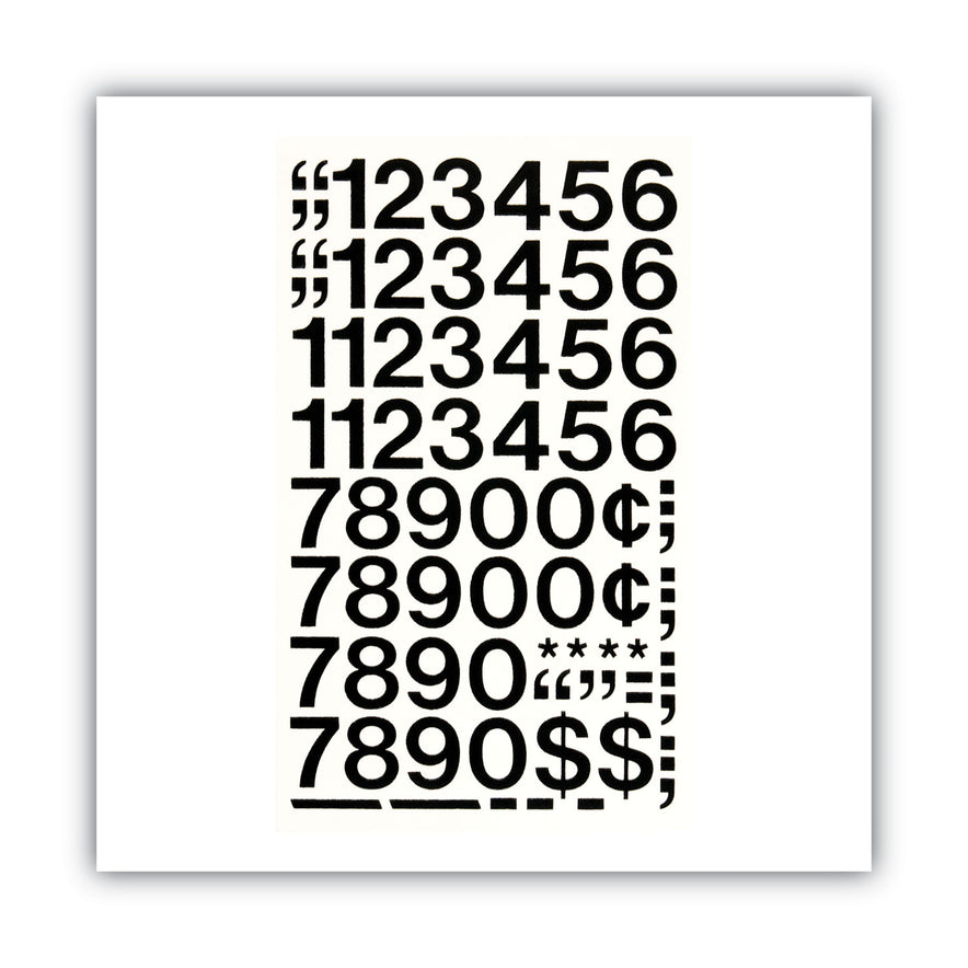 For signs, posters and equipment identification. Self adhesive vinyl will stick to most clean, dry surfaces. Can be used indoors or outdoors. Punctuation and monetary symbols included. Permanent adhesive. Numbers Only. Character Types: Numbers; Mounting Type: Self Adhesive; Character Style: Helvetica; Character Color: Black.