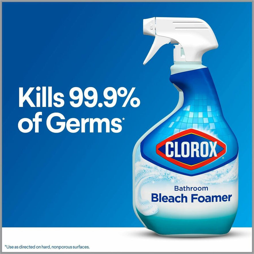 Clorox Bleach Foamer Bathroom Spray, Original, disinfects 99.9 percent of germs and leaves bathrooms sparkling clean. Powered by Clorox Bleach, this bathroom foamer cleaner easily cuts through dirt, grime and soap scum. It kills germs commonly found in the bathroom such as staphylococcus aureus (staph), streptococcus pyogenes (strep) and trichophyton mentagrophytes (athletes foot fungus). It also removes mold and mildew stains with less scrubbing so it is perfect for freshening and cleaning tubs, tile, toilets, sinks and counters. The Smart Tube technology ensures you spray every stain-fighting drop. Spray is perfect for use in high-traffic bathrooms.