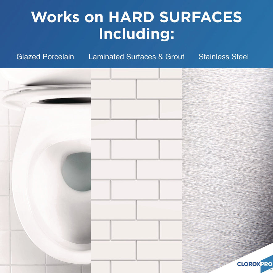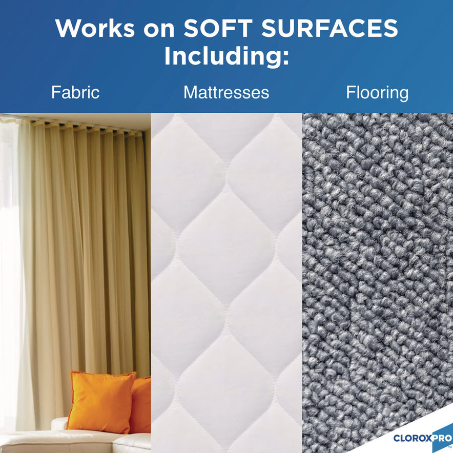 CloroxPro Disinfecting Bio Stain & Odor Remover disinfects and removes the toughest odors and stains in one step. This bleach free stain and odor remover uses hydrogen peroxide technology to kill HIV, herpes, and flu virus in 30 seconds, kills hepatitis B and hepatitis C in one minute, and kills norovirus, E. coli, Salmonella and MRSA in five minutes. It meets EPA criteria for use against SARS-CoV-2, the virus that causes COVID-19. Compliant with OSHA Bloodborne pathogens standard, Disinfecting Bio Stain and Odor Remover works on stains from blood, feces, vomit, sweat, saliva, and urine. This versatile disinfectant can be used to clean many different hard and soft surfaces such as walls, tile, grout, concrete, carpet, fabrics, upholstery, toilets, counter tops, mattresses, and it can even be used as a pre-treatment for laundry. Ideal for hotels, care centers, schools, offices, restaurants and other commercial facilities. CloroxPro, where clean means everything. Packaging may vary. Application: Hotels; Offices; Restaurants; Restrooms; Schools; Applicable Material: Acrylic; Carpet; Ceramic Tile; Chrome; Curtains; Fabric; Floors; Glass; Granite; Grout; Hardwood; Laminate; Linoleum; PVC; Plastic; Polycarbonate; Polypropylene; Porcelain; Sinks; Stainless Steel; Tile; Toilets; Upholstery; Vinyl; Wood; Chemical Compound: Hydrogen Peroxide; Isopropyl alcohol; Sodium Lauryl Sulfate; Dirt Types: Blood; Body Oils; Urine; Vomit.