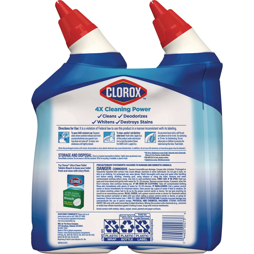 Clorox Toilet Bowl Cleaner with Bleach kills 99.9% of germs, including COVID-19 virus (SARS-CoV-2) when used as directed on hard, nonporous surfaces. Whitens and brightens your toilet bowl with the trusted power of Clorox Bleach. This powerful bleach cleans your toilet bowl while it destroys tough stains, disinfects and eliminates odors with a refreshing scent. The only toilet bowl cleaner with Clorox Bleach, it cleans and leaves toilets sparkling and bright. Deodorizes as it whitens and brightens. Uniquely angled, this dispensing nozzle makes it easy to tackle hard-to-reach areas under the bowl rim with a simple squeeze of the bottle. Flush toilet. Apply six ounces under and around the rim. Scrub entire bowl. Let sit for five minutes. Flush toilet. Disinfect and get your toilet squeaky clean with Clorox Toilet Bowl Cleaner with Bleach. Application: Toilet and Urinal Cleaner; Applicable Material: Toilets; Urinals; Dirt Types: Grime; Mildew; Mineral Scale; Mold; Organic Matter; Soil; Stains; Scent: Rain Clean.