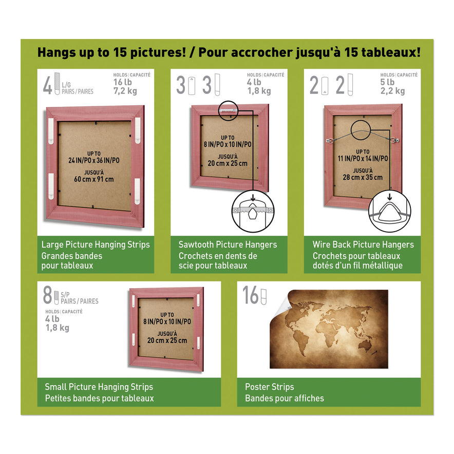 Hangs up to 15 PicturesIncludes 3 sawtooth picture hangers, 2 wire back picture hangers, 5 large strips, 4 pairs of large picture hanging strips, 8 pairs of small picture hanging strips and 16 poster strips.