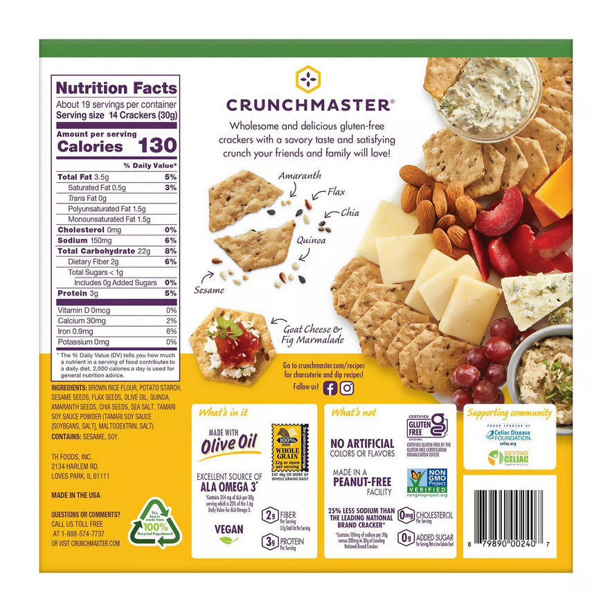 Enjoy more seeds and more flavor with these Crunchmaster 5-Seed Multi-Grain Crunchy Oven Baked Crackers. Made with sesame seeds, chia seeds, flax seeds, amaranth seeds and quinoa seeds. Made with 100% whole grain, and are non GMO, Kosher and gluten free. Pair with cheese, spreads, veggies or even seafood. A great healthy idea when your snack craving hits. Food Type: Crackers; Flavor: Original; Capacity (Weight): 20 oz; Sugar Free: No.