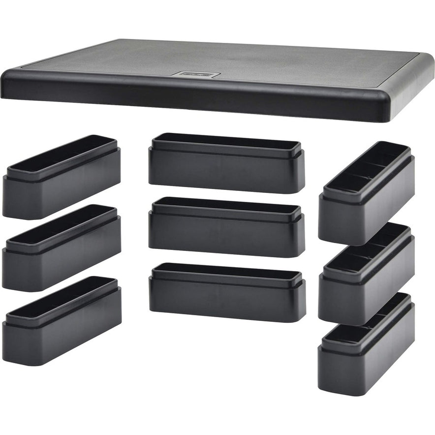 With sturdy construction and spacious design, the Stax MP-107 Ergonomic Height-Adjustable Monitor Riser/Laptop Stand accommodates your laptop, monitor or fax machines. It helps reduce strain on neck and eyes by raising your monitor to an ergonomically correct height. It is perfect for multiple monitor setups and for smaller work areas. Strong, stable design features riser blocks and 1-1/4" height adjustments up to 4-3/4". Riser comes with cable clip. It is made of recycled plastic and holds up to 66 lb.