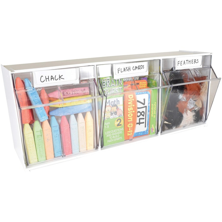 Modular unit with white frame and three clear bins features a unique interlocking design that lets you mix, match and stack different sizes. Mount bin storage system to a wall or place on a countertop. Bins tilt out, stay open and then close again with the touch of a finger. Each bin can be easily removed from locking mechanism for easy cleaning or refilling. Tilt Bin Storage System includes mounting hardware and identification labels.