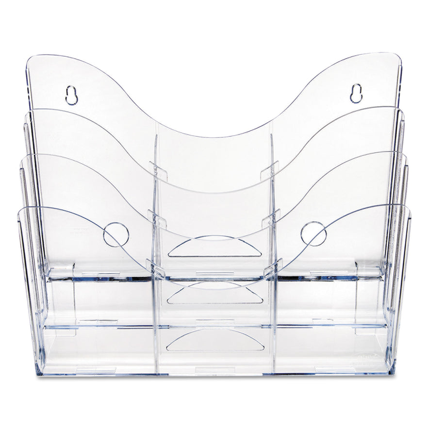 Finally a product that adjusts to your storage needs. This patented configurable display can hold a combination of magazine and leaflet/pamphlet size literature. Also accommodates letter, legal and A4 documents. Each pocket holds up to 1" capacity. Ribs at the bottom eliminate drooping. Organizer lies flat or stands upright on desktop/counter to conserve space. Also wall mountable. Includes six removable dividers to create up to nine compartments. Color: Clear; Color Family: Clear; Overall Width: 14"; Overall Depth: 3.5".