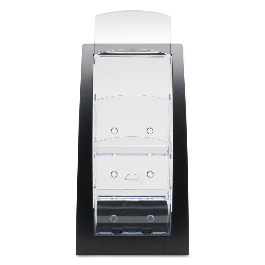 This freestanding, desktop literature holder, offers a sleek, high-end alternative to traditional holders, and features a contemporary design with three, tiered pockets for maximum literature capacity and visibility. Each pocket holds up to 1" of literature, with additional space in front to hold business cards. Sturdy plastic construction with the look of metal. Ideal for lobbies, trade shows and waiting rooms. Leaflet Size with One Business Card Holder. Color: Black; Color Family: Black; Overall Width: 6.75"; Overall Depth: 6.94".