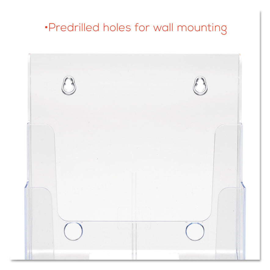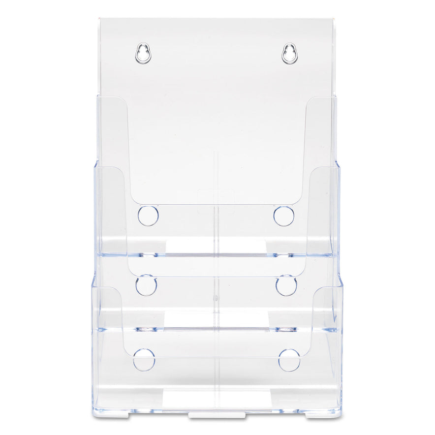 Clear, compact, multi-compartment literature holder with tiered design offers better visibility and space efficiency. Angled design keeps your materials at just the right angle for easy access. Ideal for use in financial institutions, government buildings, medical offices, lobbies, libraries and more. Use this durable, plastic literature holder as a stand-alone display on countertops, or mount on a wall to put the focus on your materials. Wall mounting hardware not included. Large 3-TieredFor magazines, brochures and catalogs up to 1 3/8" capacity. Color: Clear; Color Family: Clear; Overall Width: 9.5"; Overall Depth: 6.25".