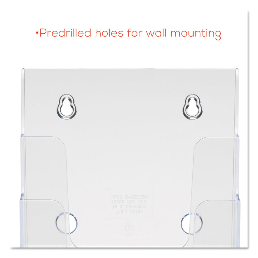 Clear, compact, multi-compartment literature holder with tiered design offers better visibility and space efficiency. Angled design keeps your materials at just the right angle for easy access. Ideal for use in financial institutions, government buildings, medical offices, lobbies, libraries and more. Use this durable, plastic literature holder as a stand-alone display on countertops, or mount on a wall to put the focus on your materials. Wall mounting hardware not included. MediumFor booklets up to 1 1/16" capacity. Color: Clear; Color Family: Clear; Overall Width: 6.88"; Overall Depth: 6.25".