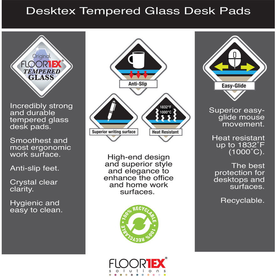 Desktex Glaciermat desk pads are manufactured from reinforced glass to provide the ultimate in desktop protection, elegance and style. Glaciermat protects from scratches, scuffs and spills and is also heat resistant to 1800°F! Guaranteed not to break, crack, or discolor under normal use. Crystal clear glass allows easy viewing of notes, lists or photographs safely stored under the mat surface. The surface can also be used as a scribble pad for notes and reminders using standard dry erase pens. Ideal protector for both office or home use. Complete with silicone feet for added stability.