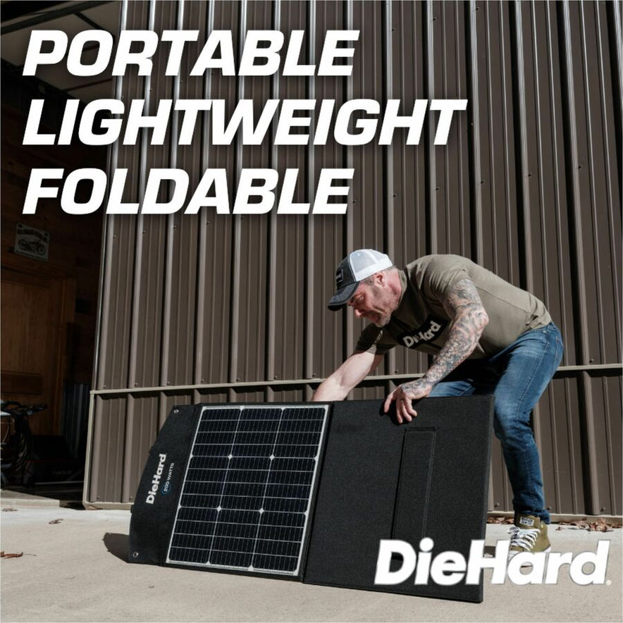 Portable, 20-volt solar panel is equipped with 200 watts of peak power. Foldable, flexible design is IP65 water-resistant and includes a 9.8' universal connector cable and an adjustable angle stand. It is the perfect companion to a DieHard portable power station (not included), giving you green power wherever you need it. Unit operates in all types of weather and withstands extreme temperatures from 14 degrees to 158 degrees Fahrenheit.