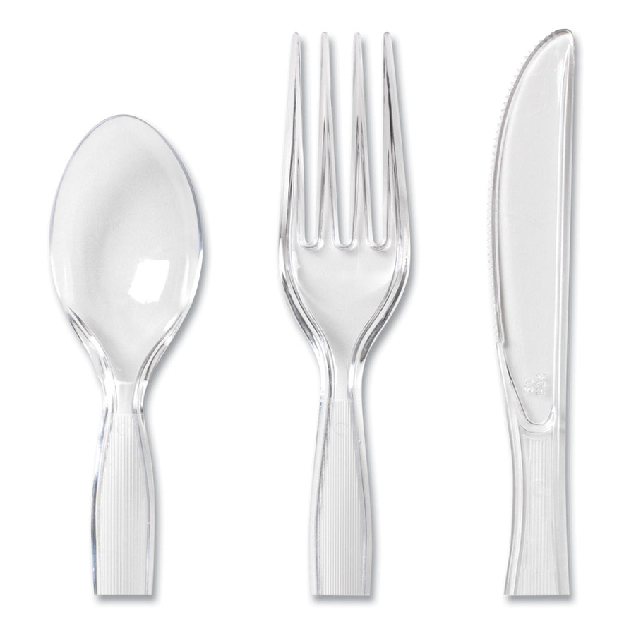 Dixie Heavy-Weight Polystyrene Disposable Plastic Forks, Knives and Teaspoons Keeper Pack Grab-n-Go trays make it easy to provide your guests with quality, crystal clear plastic cutlery. For convenience, the cutlery comes in a reclosable tray so you can just store it and use it at the next gathering. Each Dixie Heavy-Weight Polystyrene Disposable Plastic Forks, Knives and Teaspoons Keeper Pack includes 60 forks, 60 spoons and 60 knives. It's the premium choice in disposable plastic cutlery, with full-size dinner length pieces that are durable enough to handle tough-to-cut foods. Includes 180 pieces per pack60 each of forks, knives and teaspoons. Utensils Type: Combo Set; Material(s): Plastic; Color(s): Crystal Clear; Grade: Heavyweight.