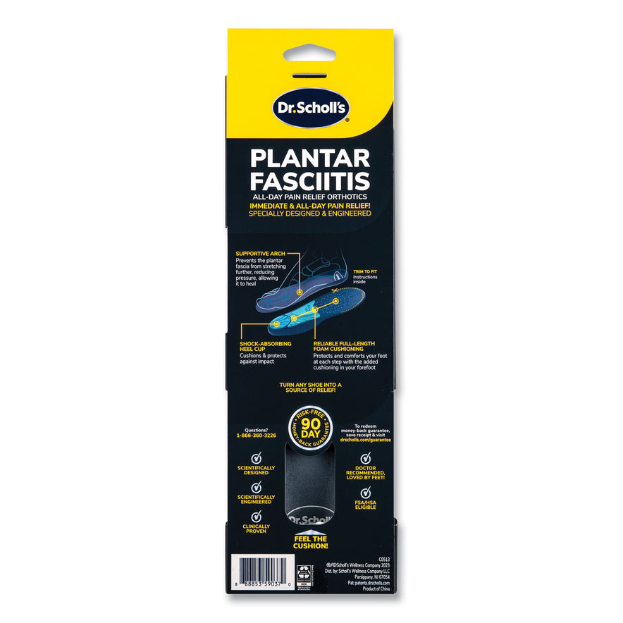 Dr. Scholl's Plantar Fasciitis All-Day Pain Relief Orthotics are specifically for people who suffer pain from plantar fasciitis pain in the heel. They are clinically proven, and scientifically designed and engineered to provide all-day pain relief from plantar fasciitis. Footwear Type: Orthotics; Size Group: Men Size 8 to 13; Material(s): Polyester; Thermoplastic Elastomer Foam; Color(s): Blue.