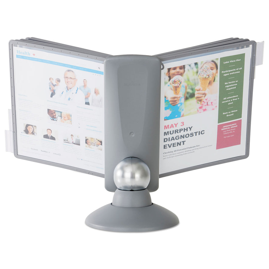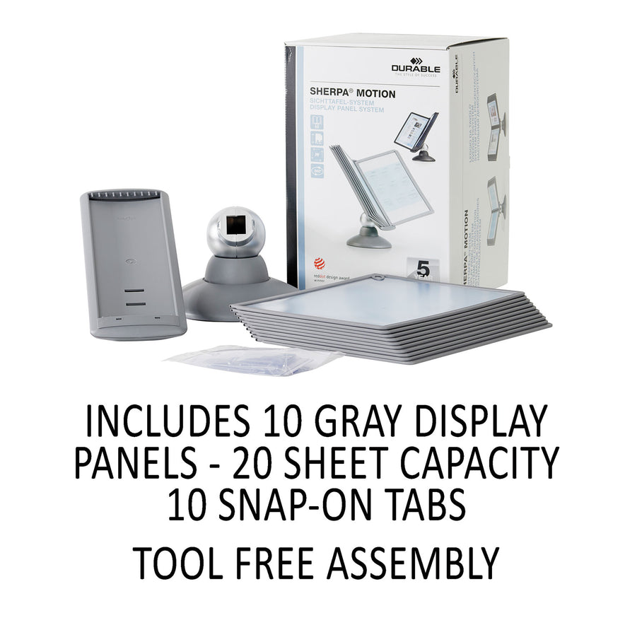 Unlock effortless organization with the SHERPA Motion Desktop Reference Display System from DURABLE. This German-designed organizational tool is meticulously crafted for anyone seeking unparalleled efficiency. Made with German precision, this desktop reference display system is a testament to quality, ensuring lasting durability. Say goodbye to flimsy alternatives and embrace the reliability of SHERPA. Experience efficiency at your fingertips with easy-load, glare-free, and scratch-resistant pockets. Each high-quality sleeve is engineered to keep your documents crease and tear-free, even with frequent handling. The durable base and rubber grips also provide a stable foundation that wont slide or tip over. With 10 pockets capable of displaying up to 20 letter-size sheets, SHERPA is the go-to solution for organizing schedules, SOPs, directories, class lists, instructions, charts, maps, emergency numbers, menus, team rosters any frequently referenced paperwork. The 10 snap-on tabs further enhance organization. Featuring 360 swivel rotation and tilting between 25 and 70, you can easily customize the system to suit your preferences. Gray Borders. Rack Style: Literature Display; Rotary; Sheet Capacity: 20; Number of Compartments: 10; Compartment Types: Double-Sided Letter.