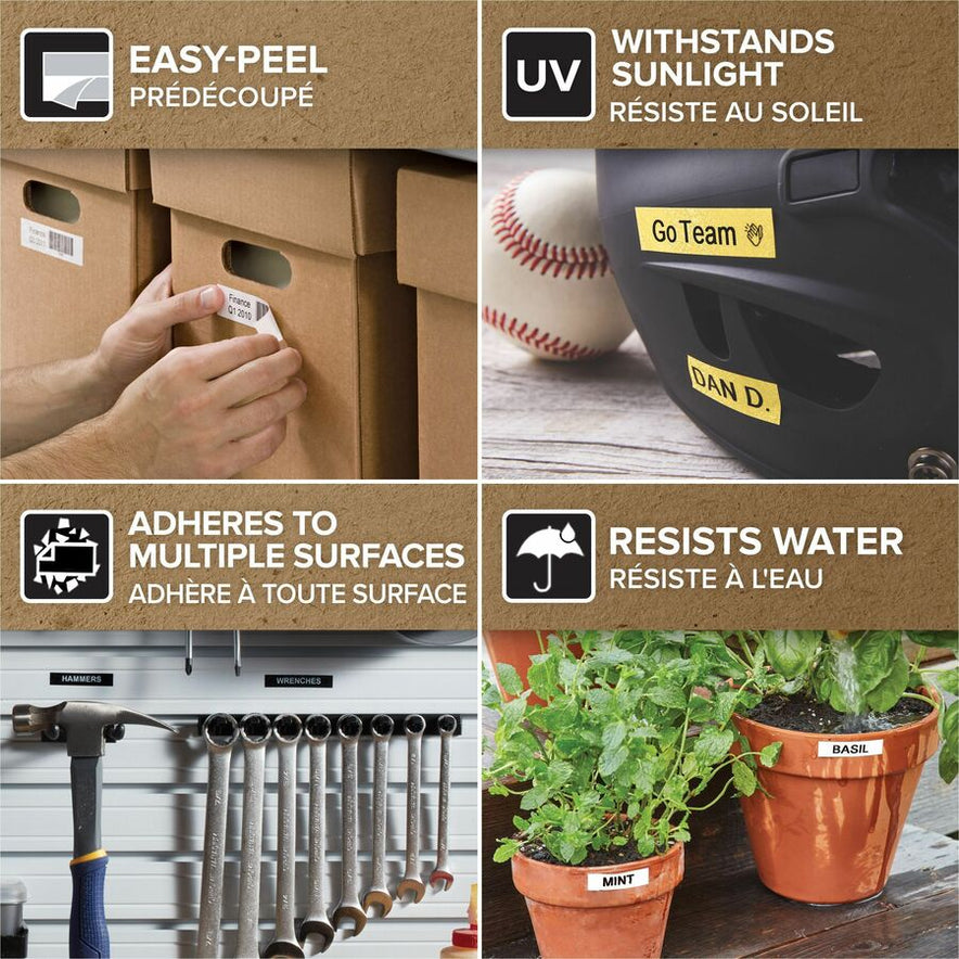 Created specifically for your LabelManager and LabelWriter Duo labelmakers, D1 labels offer the performance and variety you need for most labeling jobs. They adhere to most clean, flat surfaces, including plastic, metal and glass. Easy-peel backing means fast, trouble-free application. Versatile, durable D1 labels take the hassle out of home and office organization. Labeling tape is 1/4" wide x 23' long with black print on white tape.