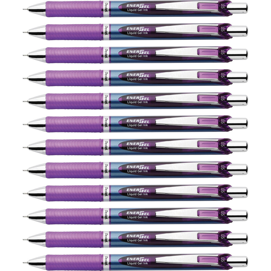 Retractable gel pen delivers the ultimate writing experience with a stainless steel tip and super-smooth blend of liquid and gel inks that glide across paper. Tip conveniently retracts to protect pockets and purses. Vivid, quick-drying ink is great for left-handed writers - no smears, no smudges, no globs. Ink formula is excellent for everyday notes yet safe for vital documents. Sleek, stylish barrel design with stainless steel accents adds to the professional look. Latex-free grip allows maximum comfort and control. Barrel and latex-free grip accents indicate color. Pen is refillable with Pentel EnerGel refill.