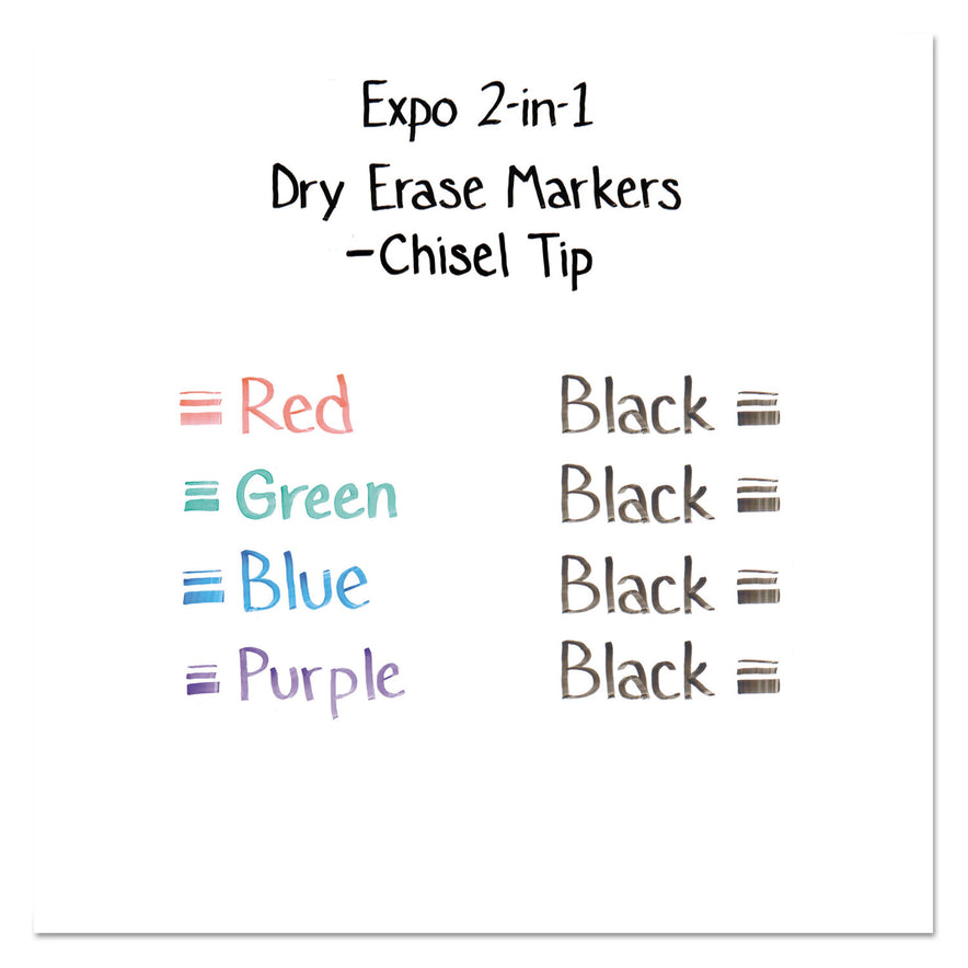 Two chisel tip colors in one dry erase marker. Use EXPO colors to track, schedule and present. Low-odor ink. For use on whiteboards, glass and most non-porous surfaces. Marker Ink Type: Dry Erase; Marker Tip Type: Chisel; Marker Tip Size (text): Fine/Broad; Marker Color(s): Assorted Primary.