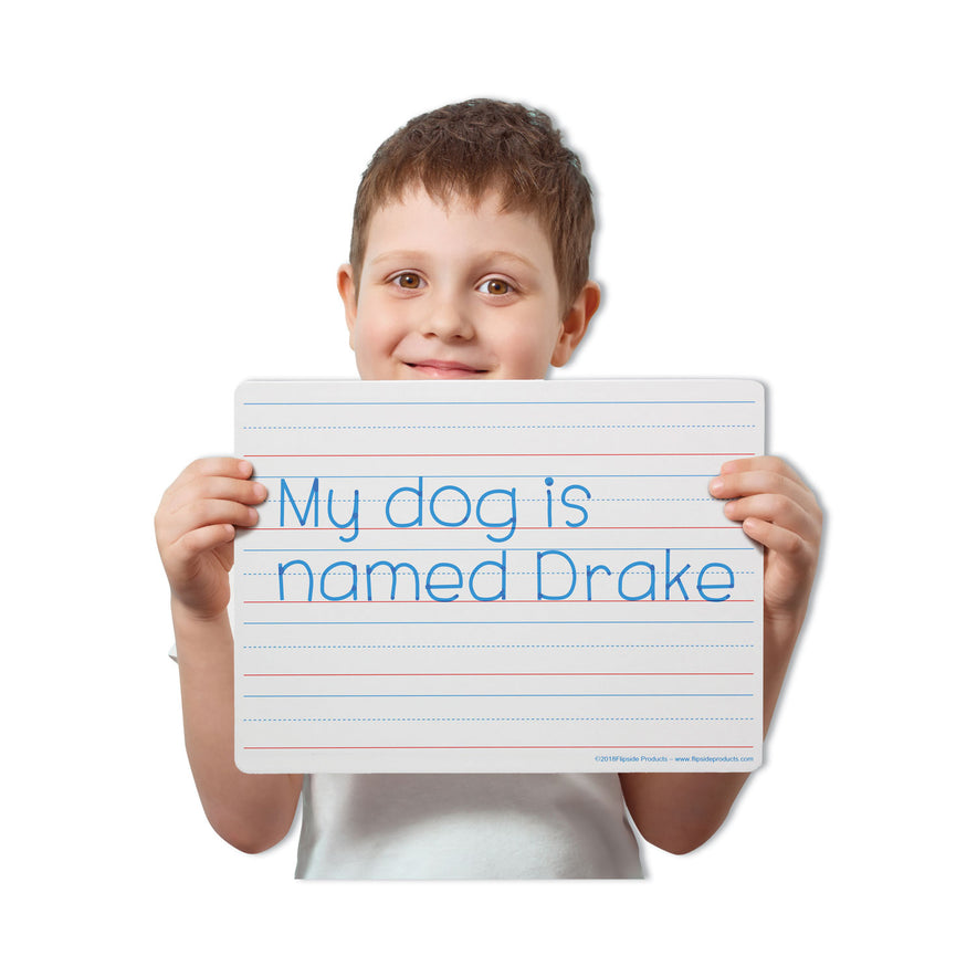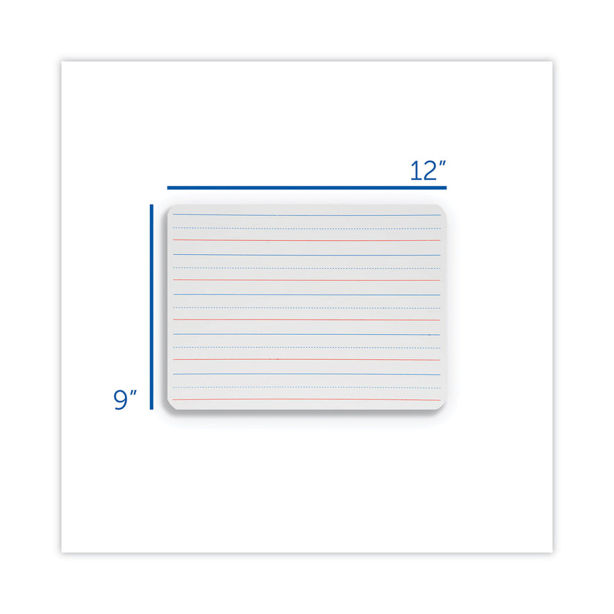 Great for teaching and practicing handwriting fundamentals, especially for early-stage learners. Bright white board's front face features five generously spaced handwriting-rule sets, with a blue headline and broken mid-line along with a red baseline. Each rule set measures 1.13" in height, with 0.38" of blank descender space between sets, which makes it ideal for students who may still be developing their fine-motor skills. Back side is unruled with a standard whiteboard surface to accommodate mathematical instruction and practice as well as artwork and visual-representation brainstorming. High-quality surfaces ensure ghost-free, write-and-wipe convenience. This board is designed specifically for use as a younger child's, heavy-use lapboard tablet, with a warp-proof hardboard core, chip-proof surfaces as well as smooth-rounded edges and corners. Frameless. Board Type: Dry Erase; Board Width: 12"; Board Height: 9"; Surface Material: Melamine.