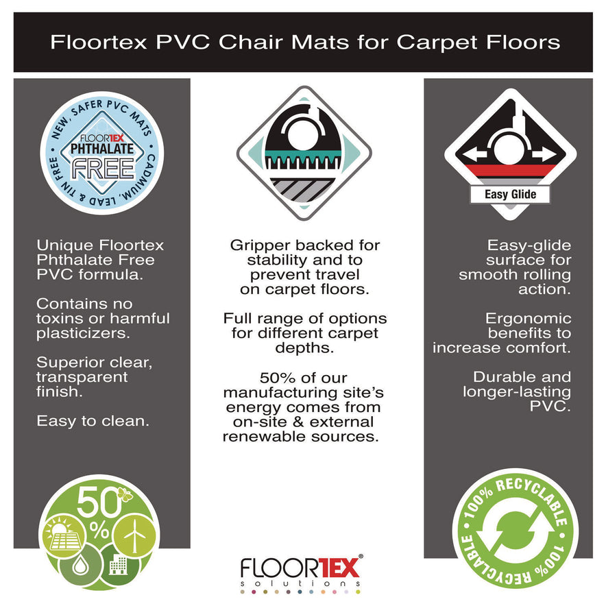 All Floortex PVC/vinyl protector mats are produced at our manufacturing site where 50% of the energy comes from on-site and external renewable sources. 100% recyclable for a reduced carbon footprint.