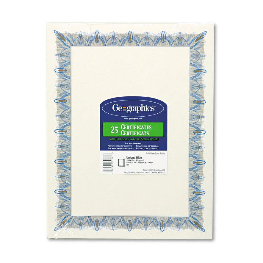 Geographics Award Certificates with Gold Seals, 8.5 x 11, Unique Blue with White Border, 25/Pack (39087)