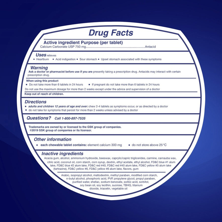 TUMS Chewy Bites Chewable Antacid Tablets go to work in seconds to make heartburn relief simple and delicious. When symptoms occur, take two to four chewable antacids, depending on the severity of your acid indigestion. Featuring the active ingredient calcium carbonate, they relieve heartburn, sour stomach, acid indigestion and provide upset stomach relief associated with these symptoms. Each chewable, gluten-free tablet delivers fast relief in every bite. They come in three delicious, assorted berry flavors. The active ingredient in these tablets can be found in nature. Extra-strength tablets come in a compact, recyclable bottle that's easy to stow for whenever heartburn strikes. With TUMS Chewy Bites, you get a tasty way to fast heartburn relief in every chewy bite.