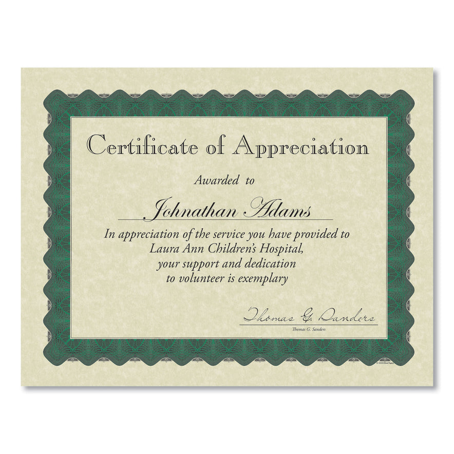 Create professional documents for graduation ceremonies, awards, and contest winners by printing custom designs on these parchment-patterned certificates. Delicate metallic border calls attention to recognized achievements. Lignin- and acid-free sheets are compatible with both inkjet and laser printers. Shape: Rectangle; Width: 11"; Height: 8.5"; Color(s): Ivory/Green.