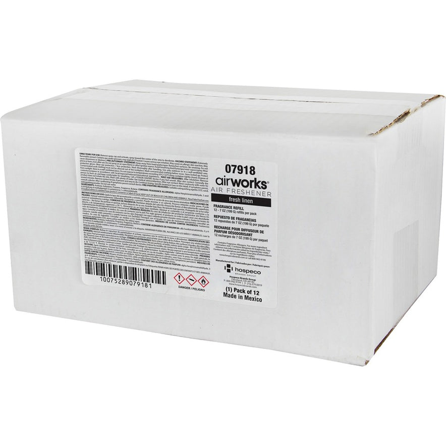 Equipped with a universal spray actuator, AirWorks Metered Aerosol Air Fresheners fit most metered spray dispensers. Each 7 oz. can deodorizes with the delightful, Fresh Linen scent. Inside Hospeco AirWorks Metered Aerosol Dispensers (not included), it covers up to 6,000 cubic feet and provides up to 3,000 metered sprays. Air freshener spray is VOC compliant.