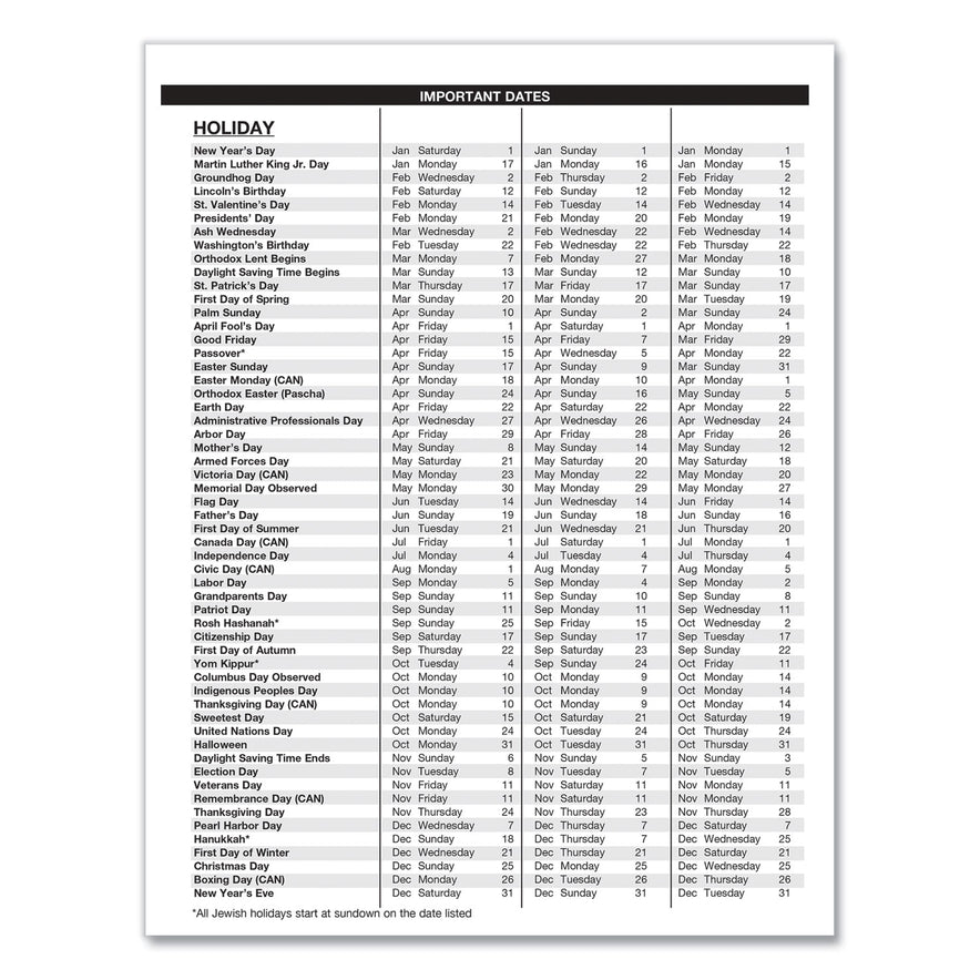 Additional page lists important holiday dates over a span of three years in list form.