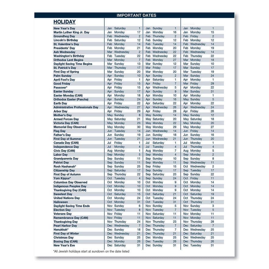 Additional page lists important holiday dates over a span of three years.