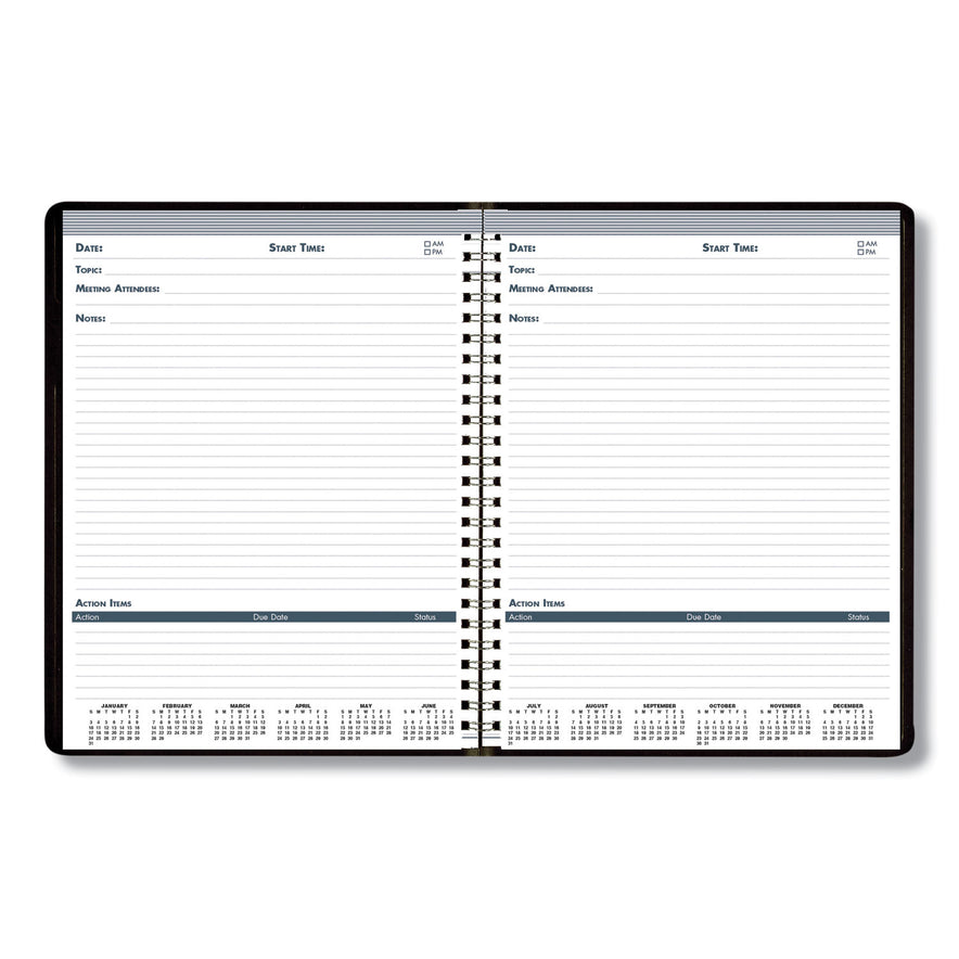 A perfect planner to keep all your meeting information. It features 110 pages for notes and follow-up action listings. Meeting pages have space for action items, attendees, topics and additional notes. A 12-month reference calendar is featured at the bottom of each two-page spread. Two-piece, durable, black hardcover folds over, making taking notes easy even without a writing surface. Made entirely of recycled materials. Dated/Undated: Dated; Calendar Format: Daily; Calendar Spread Format: One Meeting per Page; Edition Year: 2025.