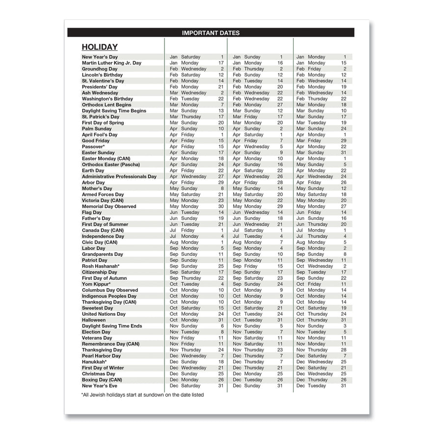 Additional pages list important holiday dates for three years in list form and a 3-year reference calendar.