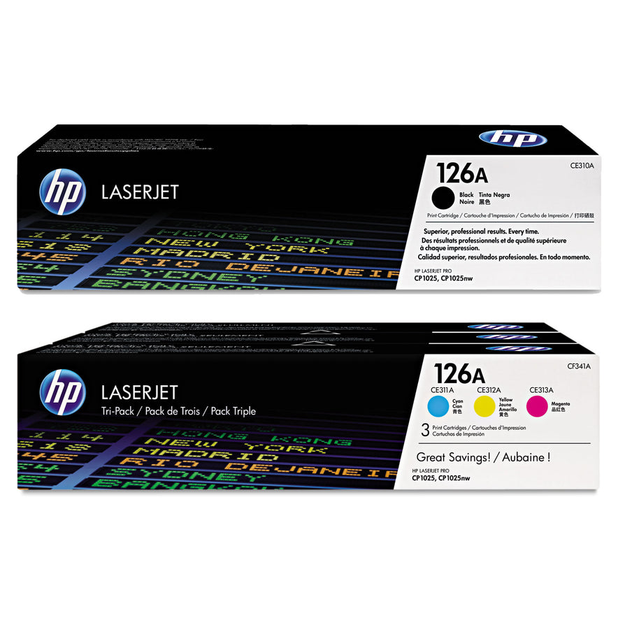 Includes 1 X HP CE310A Black Toner Cartridge, 1 X HP CF341A Color Toner Cartridge Tri-Pack (Cyan/Magenta/Yellow)